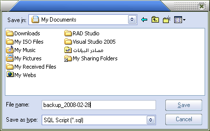 النقر على هذا الاختيار يتيح لك عمل نسخة احتياطية من قاعدة البيانات في ملف من اختيارك