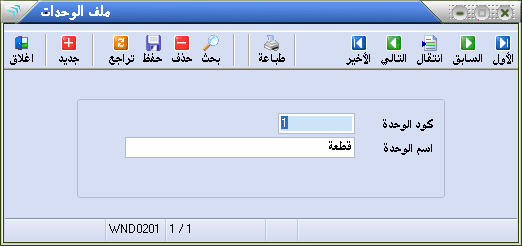 من هذه الشاشة يمكنك ادخال بيانات الوحدات ، هذه الوحدات تستخدم عند ادخالك لبيانات الأصناف لذلك يجب عليك ادخال بيانات الوحدات قبل الشروع في ادخال بيانات الأصناف